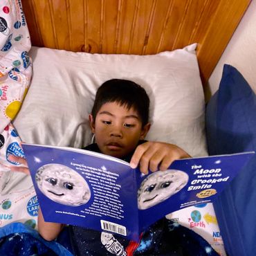 A young boy engages his imagination as he looks through his window at night to see and talk to the moon. It's not just any moon; he learns of the relationship between the sun, the moon and the Earth. He learns how it is like his relationship with his friends. They play a game of hide n' seek. His friend, Monisa, sees the same crooked smile on the moon as they discuss being friends like the sun and moon.